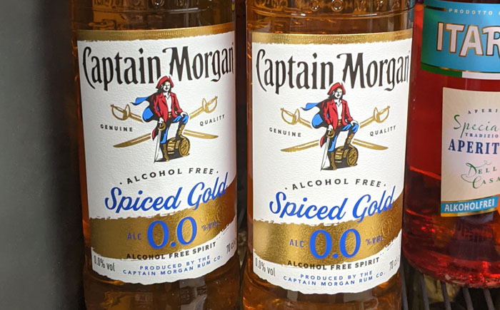 In diesem Bild von unserem Regal mit dem "alkoholfreien Alkohol" hatte vielleicht der eine oder andere von euch schon oben links den Captain Morgan in der alkoholfreien Version entdeckt.