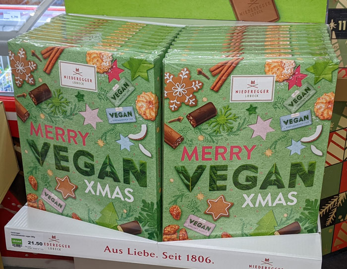 Wir haben in diesem Jahr nicht viele verschiedene Adventskalender im Angebot. Neben Massen an Edekalindt-Kalendern haben wir noch einige teurere von Ferrero (Ü-Eier/Kinder) und, ganz mutig, die veganen Kalender von Niederegger.