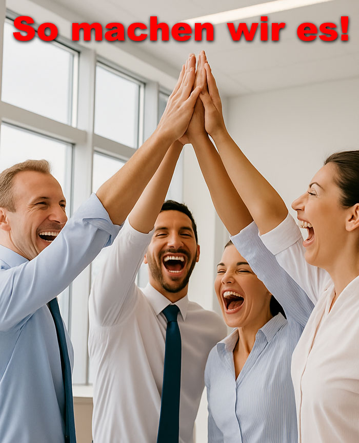 "Unbedingt seriös. Nicht zu verspielt und schon gar nicht sollen die Leute denken, wir würden hier anstatt zu arbeiten den ganzen Tag nur saufen oder kiffen." [versteckt den Flachmann in der Innentasche vom Sakko und drückt den Rest vom Joint aus]